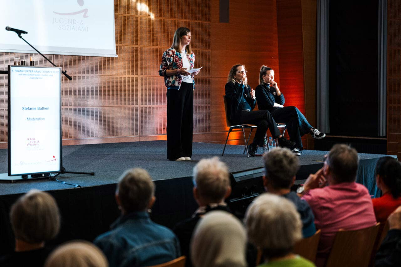 Als Moderatorin bereite ich mich auf jede Veranstaltung intensiv vor. In Gesprächen mit den verantwortlichen Personen finde ich Ziele und Herausforderung des Vorhabens heraus, ich lese Konzepte und Hintergrundpapiere. In diesem Fall war es wichtig, zu verstehen warum die Stadt Frankfurt einen neuen Weg geht und ein Bündnis gegen Kinder- und Jugendarmut gegründet hat. Diese Informationen lasse ich in meine Anmoderation einfließen und gebe dem Publikum inhaltliche Orientierung. Dazu verwende ich eine Sprache, die für alle, dem Fachpublikum und die breite Öffentlichkeit, verständlich ist.
